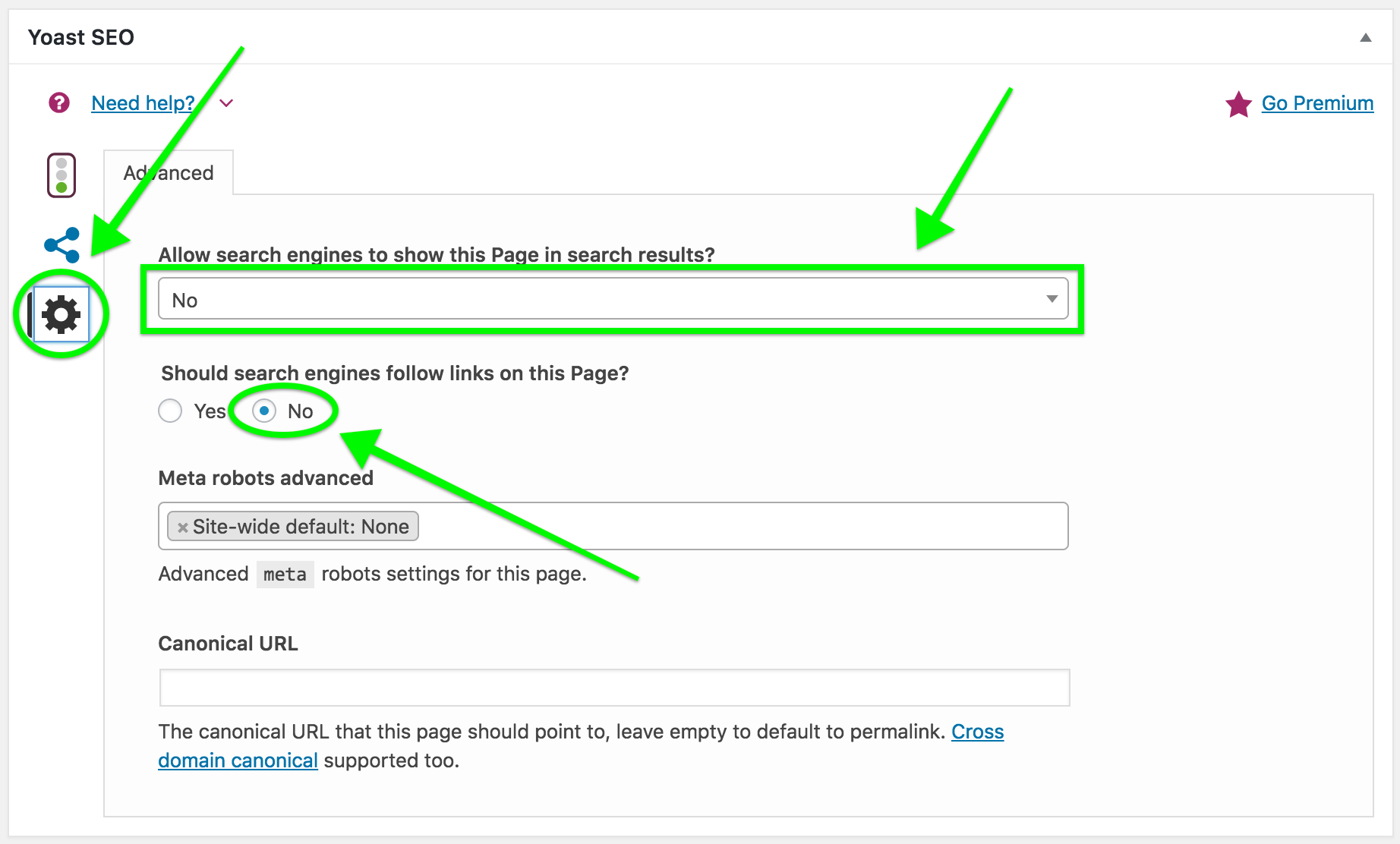 - Scroll down to the Yoast settings box, click the settings gearwheel icon, then change “Allow search engines to show this Page in search results?” and “Should search engines follow links on this Page?” to No